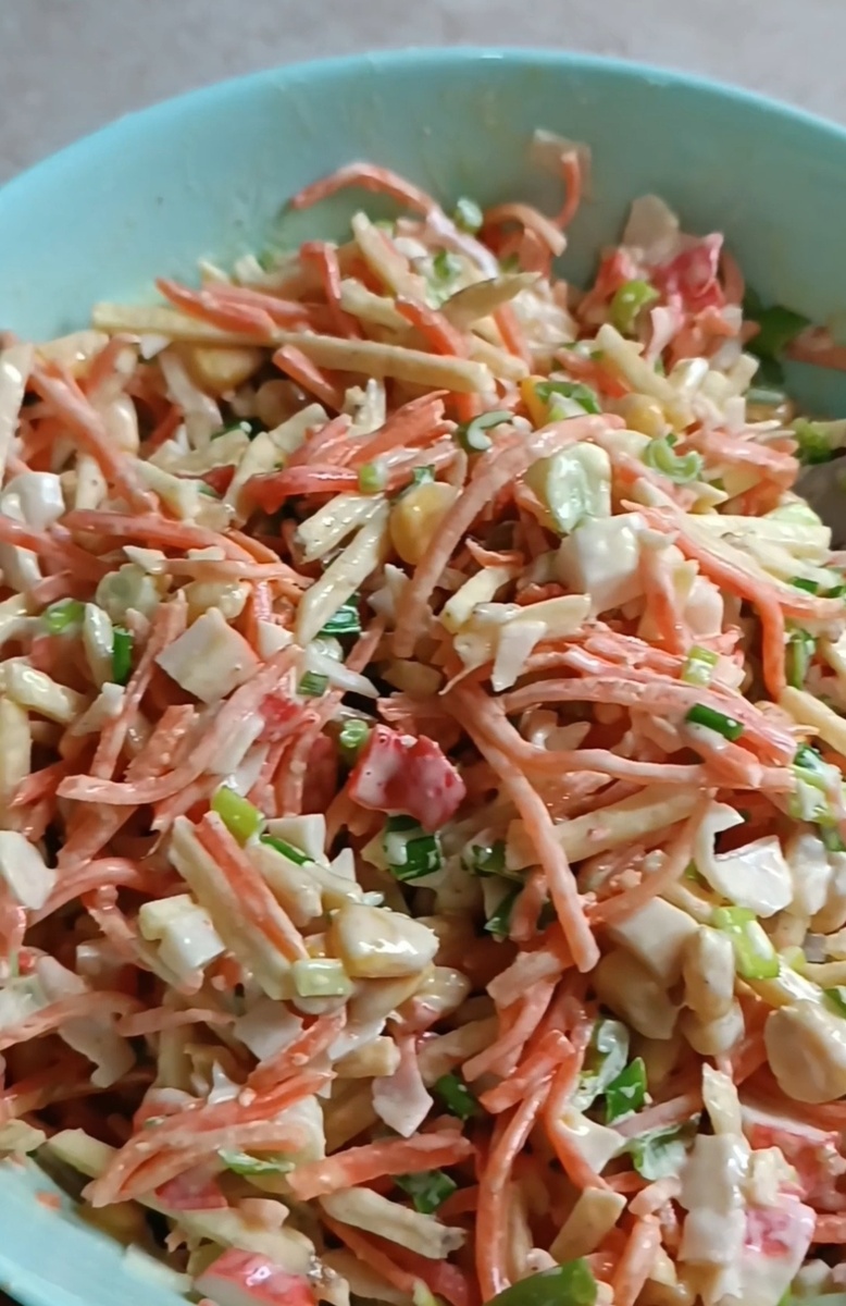 Салат за 5 минут. Когда гости на пороге. Крабовые палочки 200 гр. нарезать кубиком. Морковь по-корейски 200 гр. Лук зелёный 100 гр. Чипсы соломка 100гр. Кукуруза 300 гр. Майонез 100гр. Всё перемешать и готово.