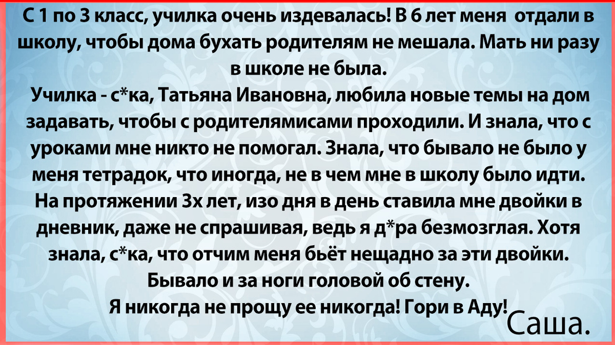 Потом она позволяла себе высказывать гадости в адрес моей младшей сестры. Я уже училась тогда в вузе, подрабатывала и имела кое-какие деньги, и подарила сестре красивые вещи впервые за ее 16 лет жизни. Училка так же поставила ее к доске и обвинила перед всеми в воровстве, что одета она слишком хорошо, для сироты из бедной семьи.
