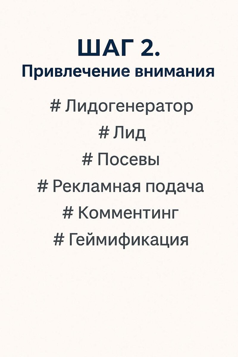 ШАГ 2. Привлечение внимания Ты можешь быть крутым экспертом, но если о тебе никто не узнает — тебя никто не купит. Задача этого этапа — сделать так, чтобы нужные люди о тебе узнали и заинтересовались. #Лидогенератор Это то, что приводит тебе новых людей. Неважно, откуда: реклама, сторис, статьи, YouTube, подкасты, рекомендации, коллаборации. Главное — чтобы они приходили и узнавали о тебе. 📌 У любого эксперта должен быть хотя бы один стабильный канал притока аудитории. #Лид Это человек, который проявил интерес к тебе, но пока ничего не купил. Подписался, кликнул по кнопке, написал в бота — он уже в твоей воронке. 📌 С ним важно не спешить продавать, а начать выстраивать диалог. #Посевы Это когда ты размещаешь информацию о себе на чужих площадках, где уже есть твоя целевая аудитория. Примеры: → нутрициолог размещает гайд в канале про женское здоровье, → психолог рассказывает о себе в блоге для родителей, → эксперт по финансам выходит с постом в рассылке онлайн-школы. 📌 Простыми сл