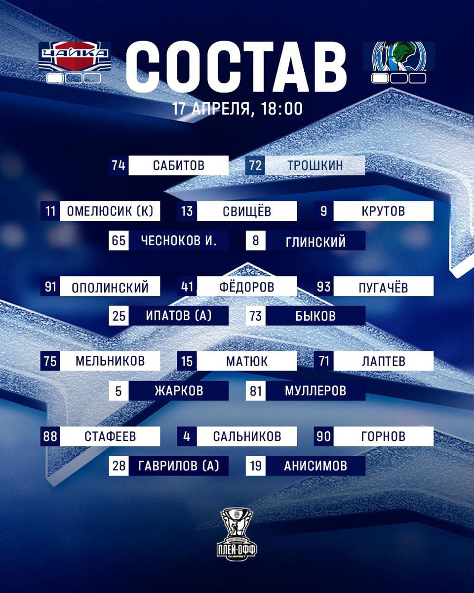 А в 18.00 во ДС им. В.С.Коноваленко МХК «Чайка» в третьем матче четвертьфинальной серии Кубка Харламова примет «Мамонтов Югры». Напомним, пока в этой серии после игр в Ханты-Мансийске ничья 1:1. Смотрим состав команды на игру. К команде присоединился Даниил Омелюсик №11. Прямая трансляция ЗДЕСЬ.
