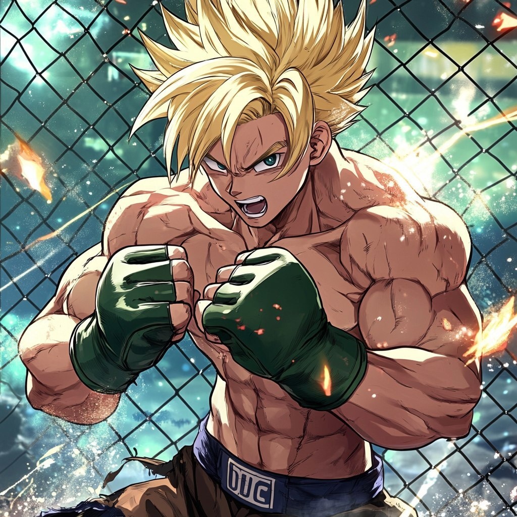 Создано на основе запроса: the character is a young attractive 21 years old male and has a physique similar as the one from Trunks in DBZ, he's a MMA fighter and is wearing full MMA modern gear, he's in fighting position on a MMA octogon, He has the same body as Trunks in DBZ (Compact muscular but not too massive), he looks like young Trunks --- Автоперевод: Персонаж - молодой привлекательный мужчина из 21 года, у которого есть телосложение, похожее на то, что от сухожилий в DBZ, он истребитель ММА и носит полное современное снаряжение ММА, он занимается борьбой с восьмимвозом ММА, у него такое же тело, что и сундуки в DBZ (компактные мускулисты Какое твое мнение? 🤔 https://dzen.ru/id/65c0c65c86e4f837c27b24d7 #ИИ #AI #нейросеть #midjourney #art