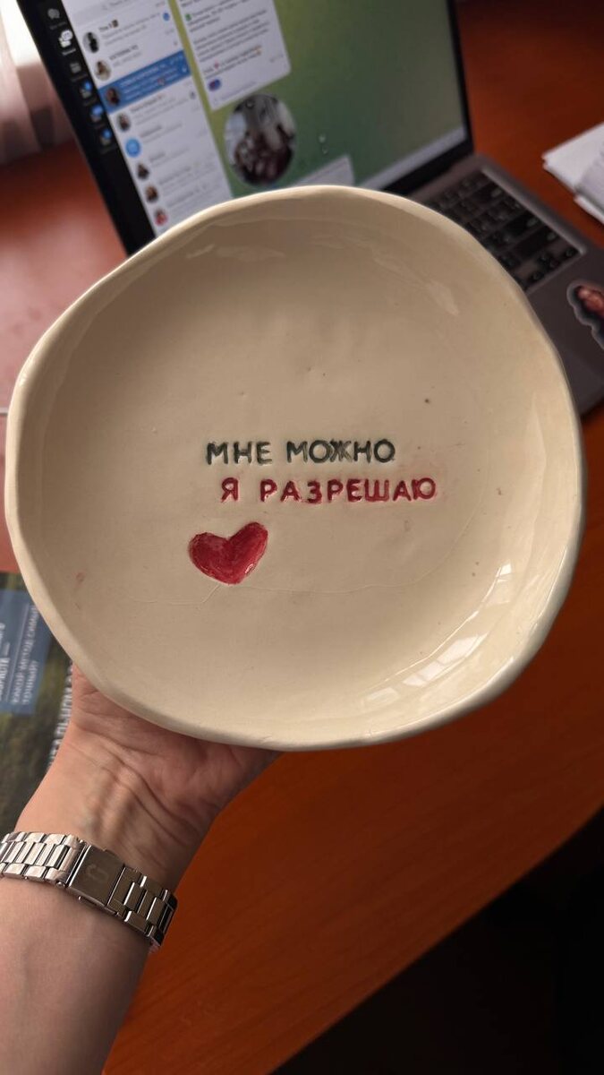 И забрала свою тарелочку, которую делала в феврале🫶 Мне кажется я нашла свое идеальное хобби ☺️ рисовать не люблю🤷♀️ я чуть с ума не сошла, когда нужно было раскрашивать надпись. Зато вот лепить я люблю