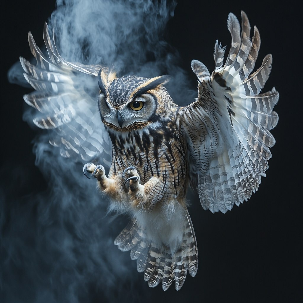 Создано на основе запроса: Hyper realistic owl mid flight showing its claws with very contrasting smoke around it sort of wrapping its wings