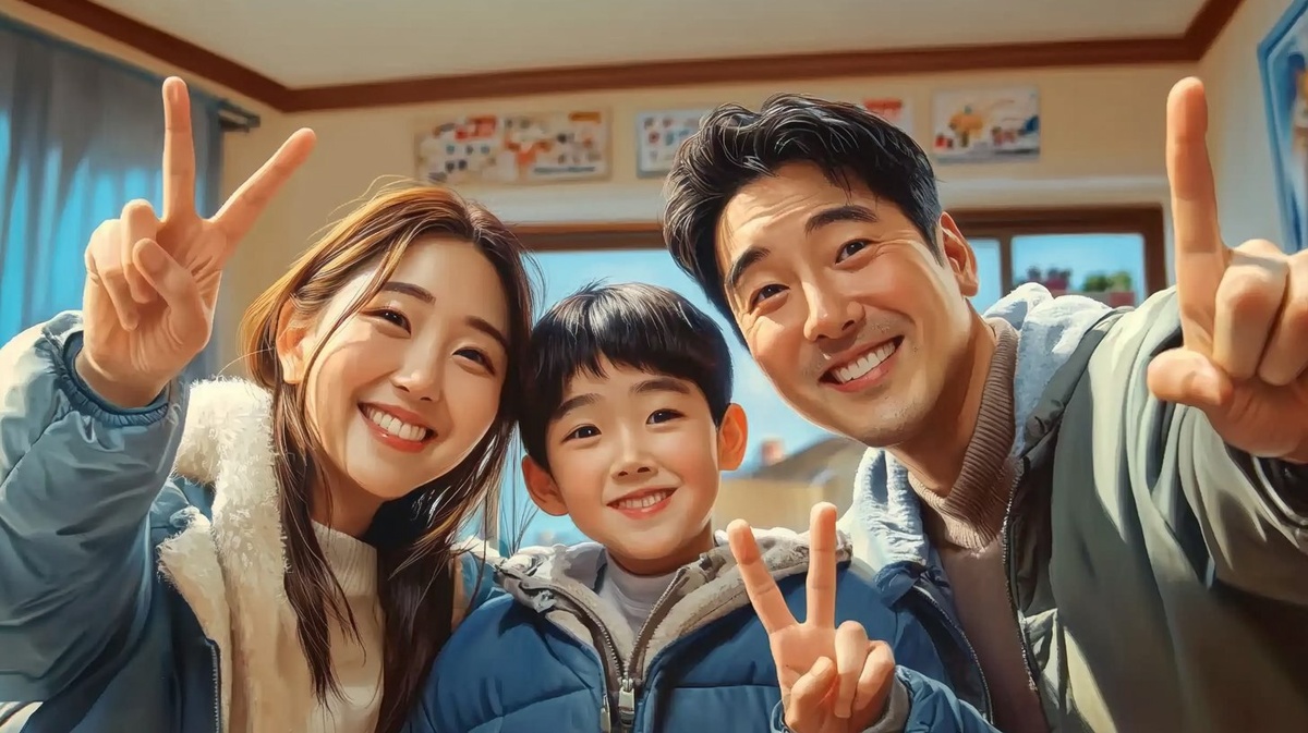 Создано на основе запроса: a hyper realistic image of a Korean family, which includes dad, mom, and son, taking photo while putting a V sign