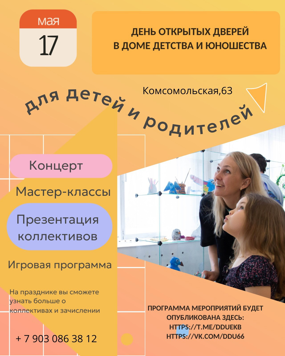 А вы знали, что есть такой замечательный ДОМ, в котором дети занимаются творчеством, танцуют, пилотируют, рисуют и находят новых друзей? А с 7 лет делают это ещё и абсолютно бесплатно 🤭 17 приходите вместе с детьми на день открытых дверей! 🔸Праздник - это отличная возможность познакомиться и присмотреть коллектив по-душе 🔸Выбрать дополнительное объединение в новом учебном году 🔸Узнать, какие коллективы есть для дошкольников и про курс подготовки к школе 📝Программа мероприятия будет опубликована чуть позднее здесь 📍 Дом детства и юношества Адрес: Комсомольской, 63 (вход со двора) ☎️Телефон для связи +7 (343) 375-11-12 Наша группа ВКонтакте Мы в телеграм