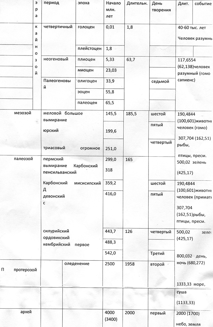 Я не понял к чему привязаны числа из колонки "длительность", оставляю без изменения. Из расчетов и таблицы видно, что Земля моложе и длительность дней творения, примерно соответствует датам геологических эпох, более в скобках. Также видно, что человек разумный мог сформироваться в более ранние эпохи и прошел более длинный путь развития.