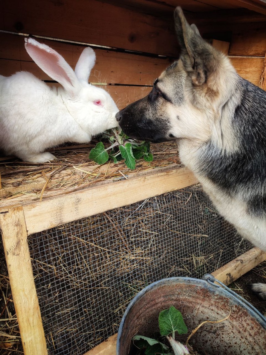Когда с делами покончено, беру подковырку и охочусь за лопухами, пока не надоест. Умка — как двухлетний малыш. Таскается следом, внимательно смотрит, крадёт добычу из ведра, раскапывает что-то своё, мне недоступное. Но самое интересное — лопухи раздавать. Это Бегемотиха, она боевая кроля и даёт отпор, когда к ней засовывается любопытная кусючая голова. Ой трудно Умке сдерживаться! Ведь какую славную можно было бы устроить потеху. Может, когда-нибудь разрешат?.. Зато кошки Умку радуют. Они ночуют во дворе, охотятся, и Мурёна часто бросает мышку под окном. Не нарочно. Просто форточка закрыта, и добычу оставляют до лучших времён, а потом забывают. А Умка находит,— и с удовольствием хрустит гостинцем. Кролики-то нажористее мышей будут, но эх, низя. Ну ничего. Лопухов поедят, зажиреют, и, может, тогда — ... #пёса_Умка