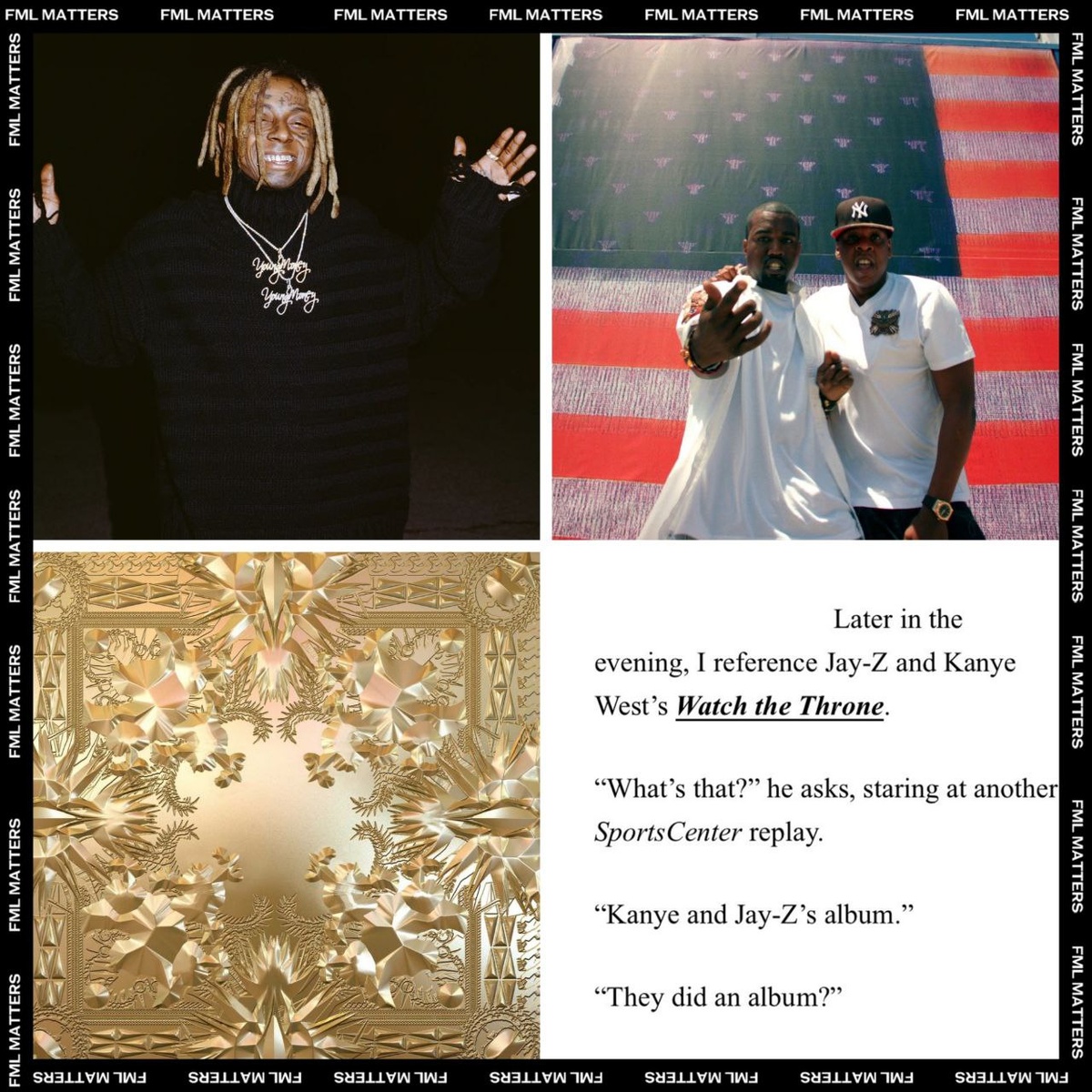 ❌ LIL WAYNE НЕ ЗНАЛ ЧТО У KANYE WEST И JAY-Z ЕСТЬ СОВМЕСТНЫЙ АЛЬБОМ! В интервью Rolling Stone рэпер признался, что ничего не знал о существования альбома «Watch the Throne». Когда разговор зашёл о нём, Уизи отреагировал искренним удивлением. — Что это? — Альбом Канье и Джей-Зи. — Они записали альбом? 💀 FML MATTERS