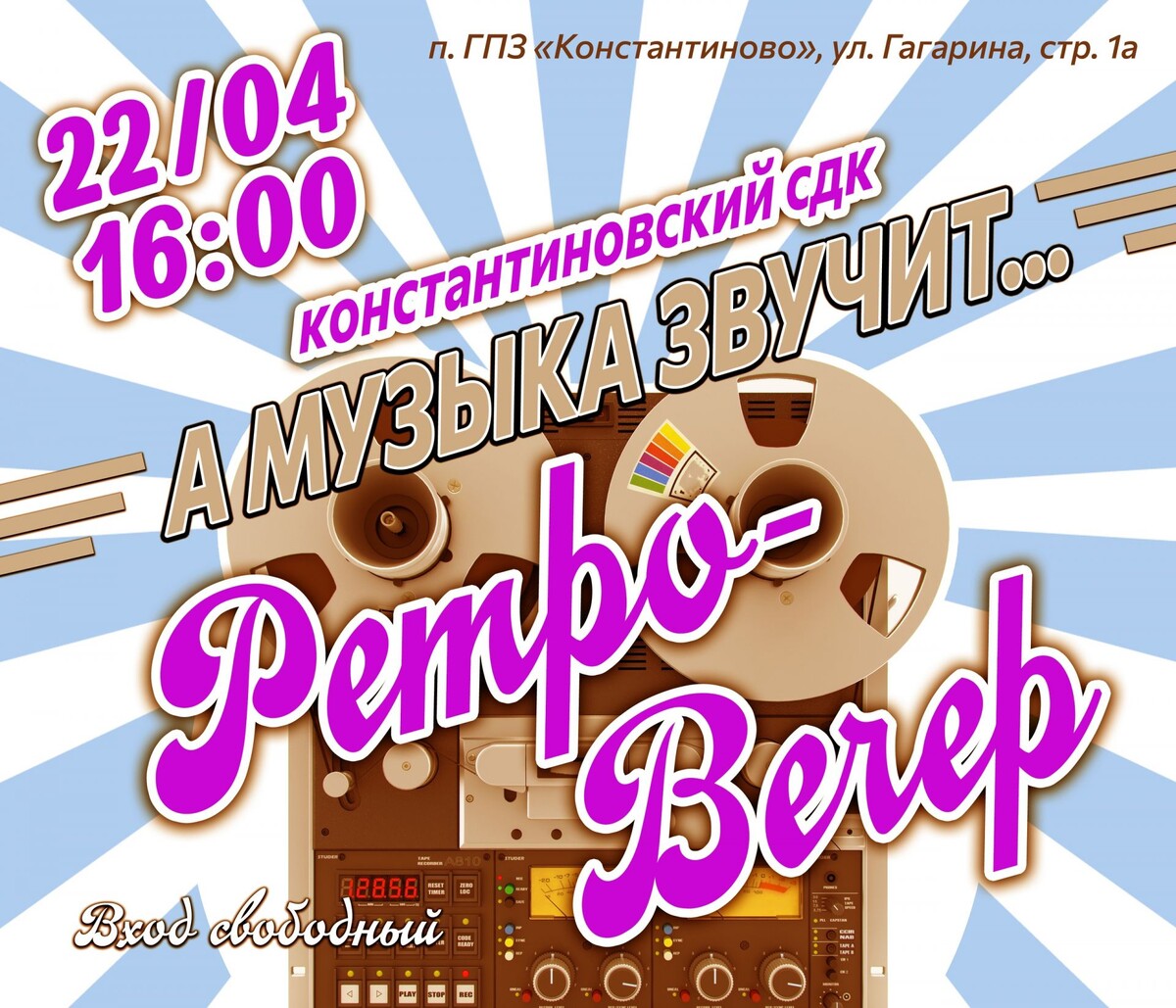 ✨ 🎶Ретро Вечер! 🎶 Дорогие друзья! Приглашаем вас на незабываемый Ретро Вечер, где вас ждут хиты прошлых лет и отличное настроение! 🌟 Приходите, чтобы провести время в отличной компании, насладиться любимыми мелодиями и зарядиться позитивом! 🎉 Вход свободный! Ждем вас! ❤ 📆 22.04.2025🕒16:00 🏢 Константиновский сельский дом культуры (СДК) 📍 г.о.Домодедово, пос.Государственного племенного завода Константиново, ул.Гагарина, д.1А 💰 Вход свободный❗️ ✅ Мероприятия Домодедово https://dzen.ru/id/66f10385cc4c5a16f7b5fb02 http://vk.com/domodedovo_events http://dzen.ru/domodedovo_events