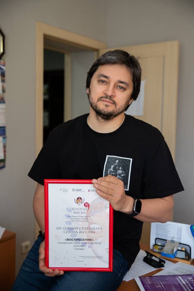 НАГРАДА НАШЛА СВОЕГО ПОЛУЧАТЕЛЯ В январе этого года спектакль Дениса Хусниярова «Воскресение» попал в лонг-лист фестиваля «Золотая Маска» Российская Национальная театральная Премия и Фестиваль-конкурс «Золотая Маска» сформировала перечень наиболее заметных спектаклей, представленных на рассмотрение в Конкурсном сезоне 2023-2024. В лонг-лист вошла постановка Дениса Хусниярова в Самарском театре юного зрителя «Воскресение».