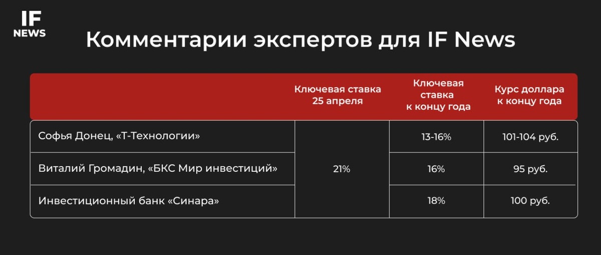 🇷🇺 Доллар будет по 100, ЦБ сохранит ставку в следующую пятницу, но даст сигнал к ее снижению Эксперты поделились с IF News своими прогнозами по ставке, курсу рубля и рассказали какие активы сейчас выглядят наиболее интересными. К каким активам присмотреться? 1️⃣ Донец считает, что наиболее интересными сейчас для инвесторов являются длинные ОФЗ и корпоративные облигации — возможность зафиксировать высокую доходность и заработать на снижении ставки. А также акции крупнейших компаний с низким долгом и уверенными показателями. Хорошей ставкой будут также фонды широкого рынка. 2️⃣ Громадин также видит длинные ОФЗ привлекательными. Однако акции, по его мнению, покажут опережающую доходность. «Замещайки» и золото тоже интересны, так как есть возможность получить прибыль на ослаблении рубля. 3️⃣ В «Синаре» отметили, что фаворитами по потенциалу роста являются акции компаний, которые пострадали от санкций и имеют умеренно высокую долговую нагрузку. Более консервативные варианты: Евротран
