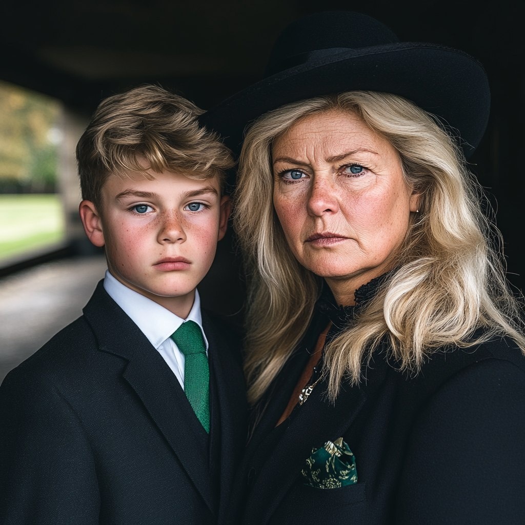 Создано на основе запроса: A white, British working-class woman in her early 50's with blonde mid-length hair, blue eyes and wearing a black dress and black hat attending a cremation. Standing next to her is her 16 year old son who has blonde hair and blue eyes and is wearing a dark suit and green tie. They are looking seriously into the camera and behind them is a modern British crematorium. They look imperfect, engaging and the image should be a close up of their faces, showing their lines and moles etc --- Автоперевод: Белая британская женщина из рабочего класса в ее начале 50-х годов со светлыми волосами средней длины, голубыми глазами и черной платьем и черной шляпой, посещающей кремацию. Необычно получилось? 🤔 https://dzen.ru/id/65c0c65c86e4f837c27b24d7 #ИИ #AI #нейросеть #midjourney #art