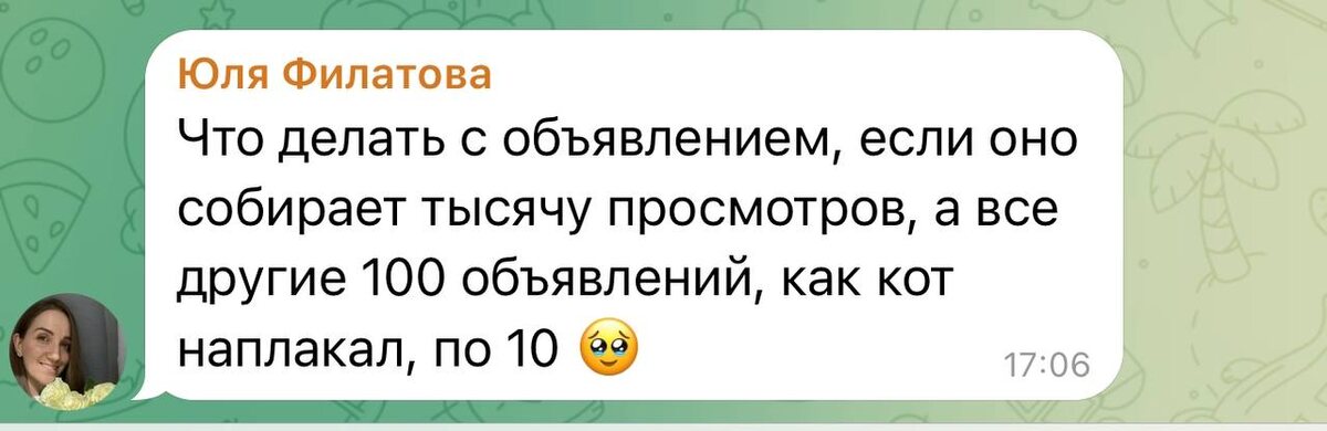 1000 просмотров и НОЛЬ клиентов?! 🤯 ЧТО ДЕЛАЮ НЕ ТАК? Что делать с объявлением, которое собирает тысячу просмотров, а остальные 100 объявлений – по 10 просмотров? Знакомая боль? Особенно если вы работаете в категории "Товары" и считаете каждый контакт. У меня, например, 15 000 объявлений по автостеклам. И да, они тоже набирают по 1-2 просмотра. Моя главная цель – превратить эти просмотры в реальные звонки и заказы. И тут все средства хороши ⬇️⬇️⬇️ Рассылки скидок, суперцелевые узконаправленные объявления. Но если: 0 просмотров, 0 контактов, 0 избранных То такое объявление я бы рекомендовал удалить и перевыложить, чтобы оно не тянуло ваш аккаунт вниз и его не пессимизировало 👌 P.S. Кстати, кто хочет разобраться в стратегиях Авито, получать разборы своих проблемных ситуаций, двери Бойцовского клуба Авито ещё открыты ДВА ДНЯ, и вы можете стать участником. Дублирую ссылку на вход ⬇️ https://t.me/boitsovskiyclub_pay_bot?start=dl-1733303013ca2645362e8d