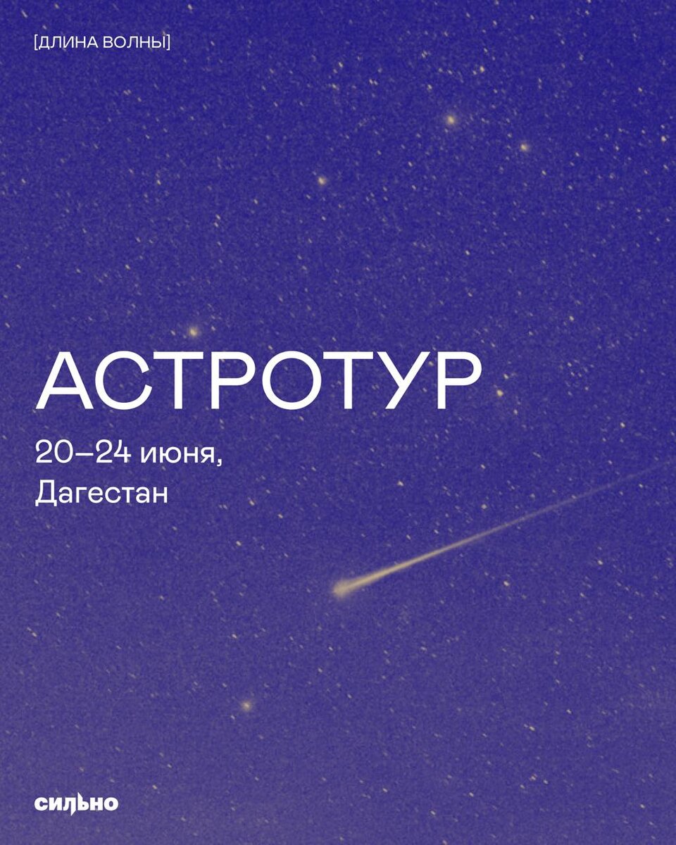 Открываем набор на Астротур от команды резиденции «Сильно» и журнала [ДЛИНА ВОЛНЫ]. Даты: 20–24 июня, Дагестан Отправимся в горы Северного Кавказа, чтобы увидеть природный ландшафт без избыточного света, понаблюдать за звёздами, подумать о световом загрязнении и методах борьбы с ним. Всё это — вместе со светодизайнером и астрономом. 🟡 Экспедиция Станем ответственными астротуристами: несколько дней будем наблюдать за тёмным небом с уважением к аутентичной культуре горного села. А перед этим заглянем в самые вкусные и интересные места Дербента. 🟡 Практикумы Научимся работать с телескопом и приложениями, чтобы читать звёздное небо. А ещё будем писать небольшие путевые заметки и думать о свете и темноте в собственных проектах. 🟡 Лекторий Поговорим об астрономии востока, светодизайне и возможностях естественного и искусственного света, работе с текстом — и о том, как всё это совместить. 🟡 Астрофотография Будем фотографировать всё интересное — в конце поездки получится коллекци