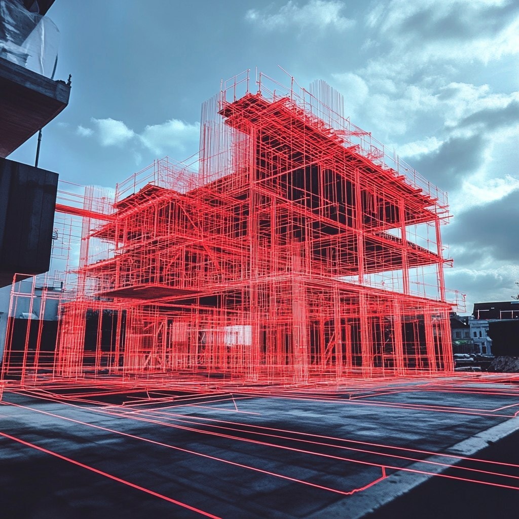Создано на основе запроса: image of a 3d site mapped hollogram of a building on a real construction site. the building is just red lines like a 3d blueprint --- Автоперевод: Изображение 3D -сайта отображала холлограмму здания на реальной строительной площадке. Какое твое впечатление? 🤔 https://dzen.ru/id/65c0c65c86e4f837c27b24d7 #ИИ #AI #нейросеть #midjourney #art