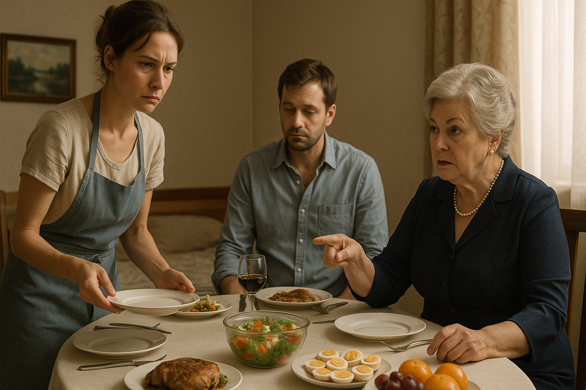 — И салат этот, — громко объявила Валентина Павловна из гостиной, — пересолен. У меня рецептура другая была... но раз ты у нас теперь хозяйка, ну-ну.