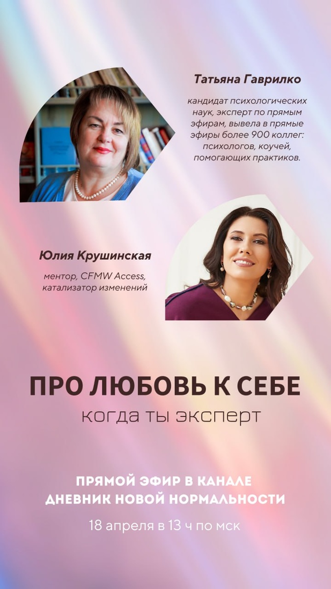 Завтра 18 апреля в 13 ч по Москве поговорим о любви к себе в контексте экспертной деятельности. Мой гость - Татьяна Гаврилко, кандидат психологических наук, эксперт по прямым эфирам. Вывела в прямые эфиры более 900 коллег: психологов, коучей, помогающих практиков. Таня говорит о себе: "Больше всего люблю убирать страх и влюблять женщин в себя и в прямые эфиры". Месяц назад мы провели с Таней эфир в ее канале на тему «Прояви себя. Страхи и ограничения. Что делать?» На нем мы договорились встретиться еще раз, чтобы развернуть тему любви к себе. Приглашаю вас завтра присоединиться к нашему разговору в канале Дневник Новой Нормальности. Увидимся!