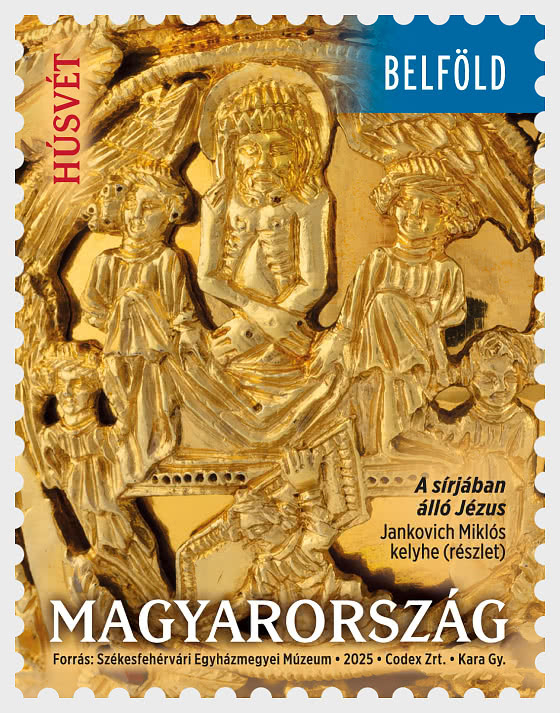 На марке «Пасха 2025» изображена деталь чаши барельефа с изображением Христа, стоящего в гробнице. На верхнем крае листа из 50 марок нанесён штрихкод, а на других краях — праздничные поздравления на венгерском, английском, немецком и французском языках. Сетка, которая была удалена во время печати, помогает отделить марки от листа. Листы из 50 марок были напечатаны методом флексографической печати. Основным элементом обложки первого дня и оттиском специального почтового штемпеля на ней является чаша с радиальными линиями, имитирующими мистическое сияние евхаристической чаши, и надписью «Пасха». Чаша является символом благодати, веры и прощения грехов с тех пор, как Христос принял страдания и учредил Евхаристию.