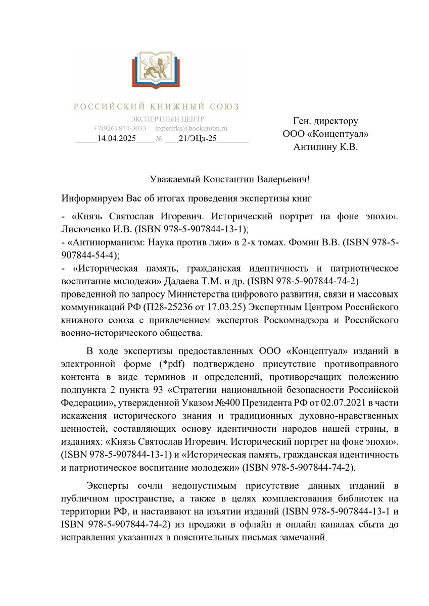 Случилась любопытная история - на роль строгих цензоров, которые могут указывать издателям что и как нужно издавать, стал претендовать - Экспертный центр Российского книжного союза. Они по поручению от МинЦифры проанализировали три книги издательства "Концептуал”. И теперь РКС в двух книгах “подтверждает наличие противоправного контента” и строго требует изъять издания из продажи. Прежде чем проанализируем суть претензий, давайте вспомним, что: