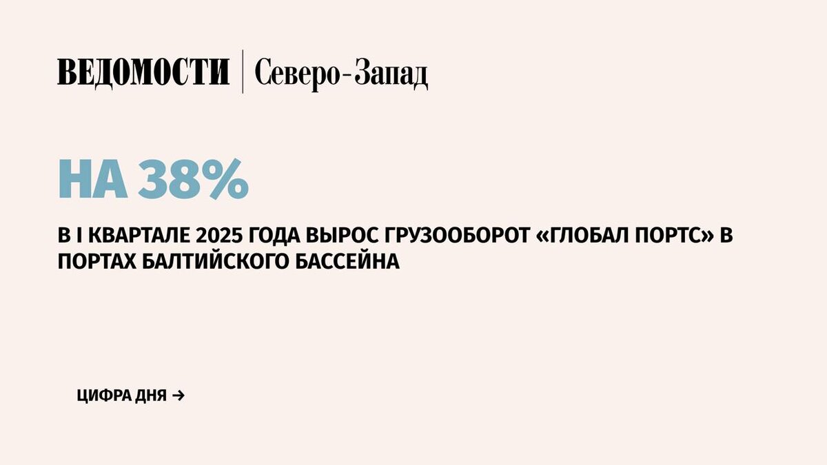 Консолидированный контейнерооборот морских терминалов стивидорного холдинга «Глобал Портс» (входит в ГК «Дело») в Балтийском бассейне в I квартале 2025 г. составил 213 000 TEU. Это на 38,1% больше по сравнению с аналогичным периодом прошлого года, сообщила пресс-служба холдинга. ⚪️Совокупный контейнерооборот морских терминалов российских портов в Балтийском бассейне, включая Калининград, за январь-март 2025 г. составил 460 000 TEU. Это на 12,7% больше, чем за I квартал прошлого года. ⚪️Компания намерена наращивать перевалку минеральных удобрений и планирует инвестировать в соответствующую инфраструктуру. ⚪️В пресс-службе холдинга напомнили, что в I квартале 2025 года на терминале «Петролеспорт» был запущен комплекс по перевалке навалочных грузов с использованием контейнерной технологии. Пропускная способность комплекса составляет 2,4 млн т в год. 📰 Подпишитесь на «Ведомости Северо-Запад»