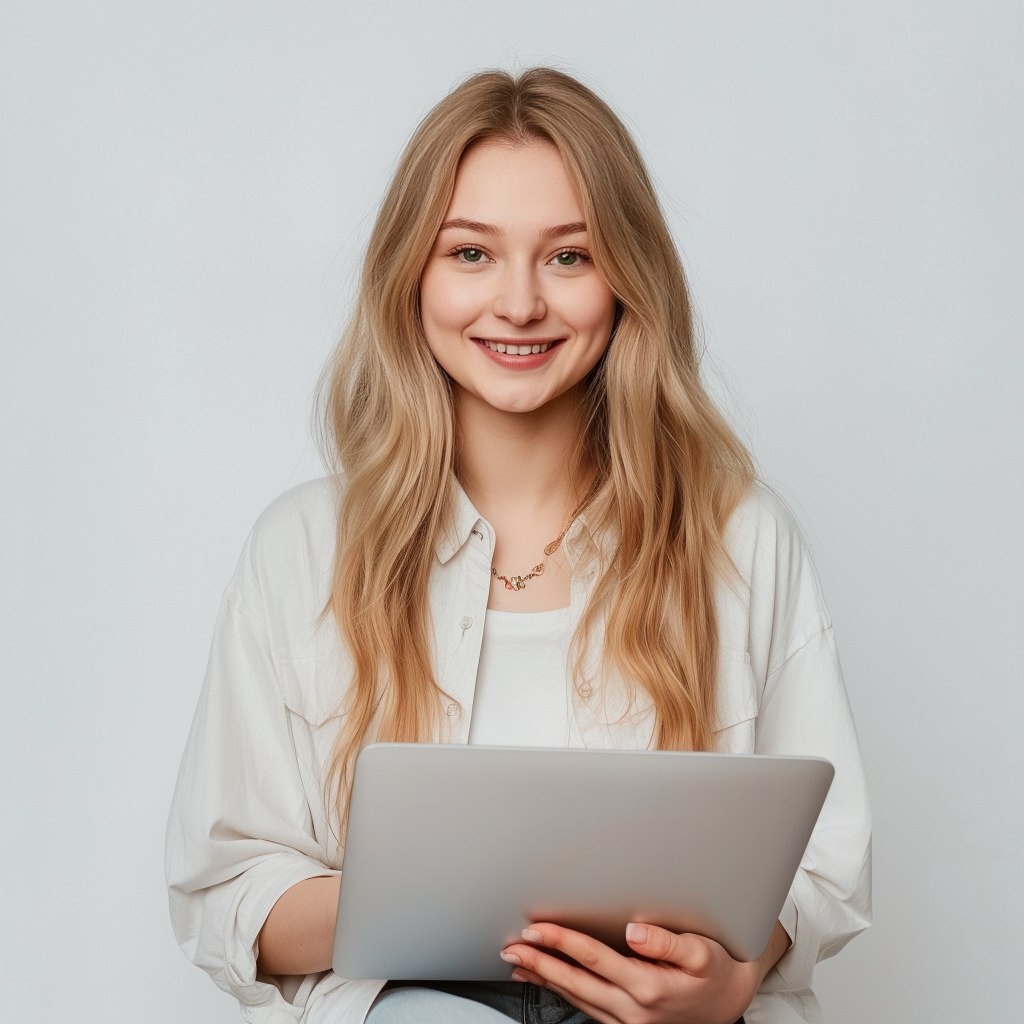 Создано на основе запроса: wearing white casual, hands with laptop