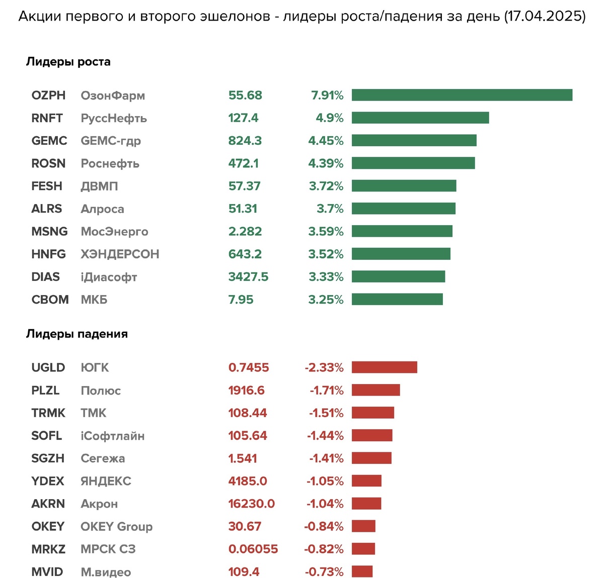 Всем привет! По итогам основной сессии 17 апреля индекс Московской биржи прибавил 0,1%. Топчемся на месте. Доллар продолжает торговаться в районе 82 рублей. Изучил ожидания наших читателей по курсу на конец года. Более половины ждет возвращения в диапазон 90-100 руб, еще почти 25% выше 100 руб. Мнение аналитиков Goldman Sachs давал на днях: Ну, если все ждут минимум 10% рост курса. А реально он может быть 20% от текущих 82 рублей. Стало интересно как читатели используют эту возможность: Забавно, но 50% никак. Ну, а если рост будет выше 100 рублей? Лично я подстраховываюсь покупая долларовые облигации. Да, они пока особо с курсом не коррелируют - при падении курса - растут в цене, чтобы сохранить рублевую стоимость, а при росте - падают. Но купоны и погашение ведь пройдут по актуальному курсу. Для себя решил, что этот вариант устраивает. ТМК отказалась от выплаты дивидендов: Сбер обещает объявить дивиденды до конца апреля: Хэдхантер объявит решение по дивидендам на следующей неделе: Н