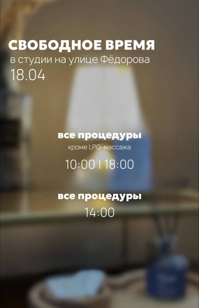 СВОБОДНОЕ ВРЕМЯ НА ФЁДОРОВА 18.04 • ONLINE запись • WHATSAPP Ждём вас к нам на процедуры 🤍