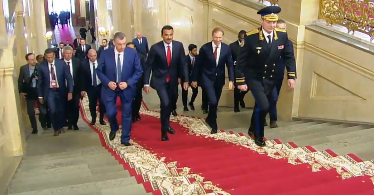 Эмир Катара Тамим Бен Хамад Аль Тани в сопровождении членов делегации страны приехал в Большой Кремлевский дворец на переговоры с президентом РФ Владимиром Путиным в Москве в четверг. Ранее эмир Катара прибыл в Москву с официальным визитом по приглашению российского лидера. В пресс-службе Кремля заявили, что главы государств обсудят ключевые вопросы двусторонних отношений с акцентом на укрепление сотрудничества в торгово-экономической и гуманитарной сферах, а также ряд актуальных международных тем, включая ситуацию на Ближнем Востоке.