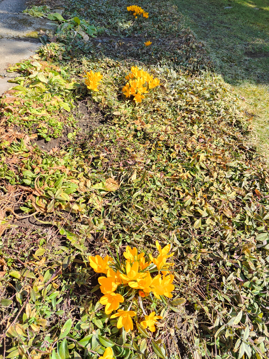 Даже начинающим садоводам понятно, что такая зависимость существует. Но насколько она существенная? Чтобы было нагляднее, проведём сравнение на примере одного сорта, ведь разные сорта могут отличаться временем начала цветения. Название сорта неизвестно, покупался сто лет назад в смеси с другими сортами. Посажены эти жёлтенькие цыплятки на длинной рабатке вдоль центральной дорожки. Расстояние между куртинами примерно метр. Рабатка ориентирована с запада на восток. В принципе, здесь довольно солнечно, только есть нюанс: скользящая тень от очень высокой взрослой ёлки. Вот на фото, в верхней части, как раз видно, что частично цветник на солнце , а частично - в тени. Время - около полудня. Западный край рабатки освещён уже с утра, примерно часов с девяти-десяти. А восточный край получает солнце только ближе к часу дня. Начали цвести крокусы ещё до снега. Вот самое первое фото крокусов нынешнего сезона, 4 апреля. Это начало рабатки, западная часть, солнечная. На заднем плане, вверху фото, ви