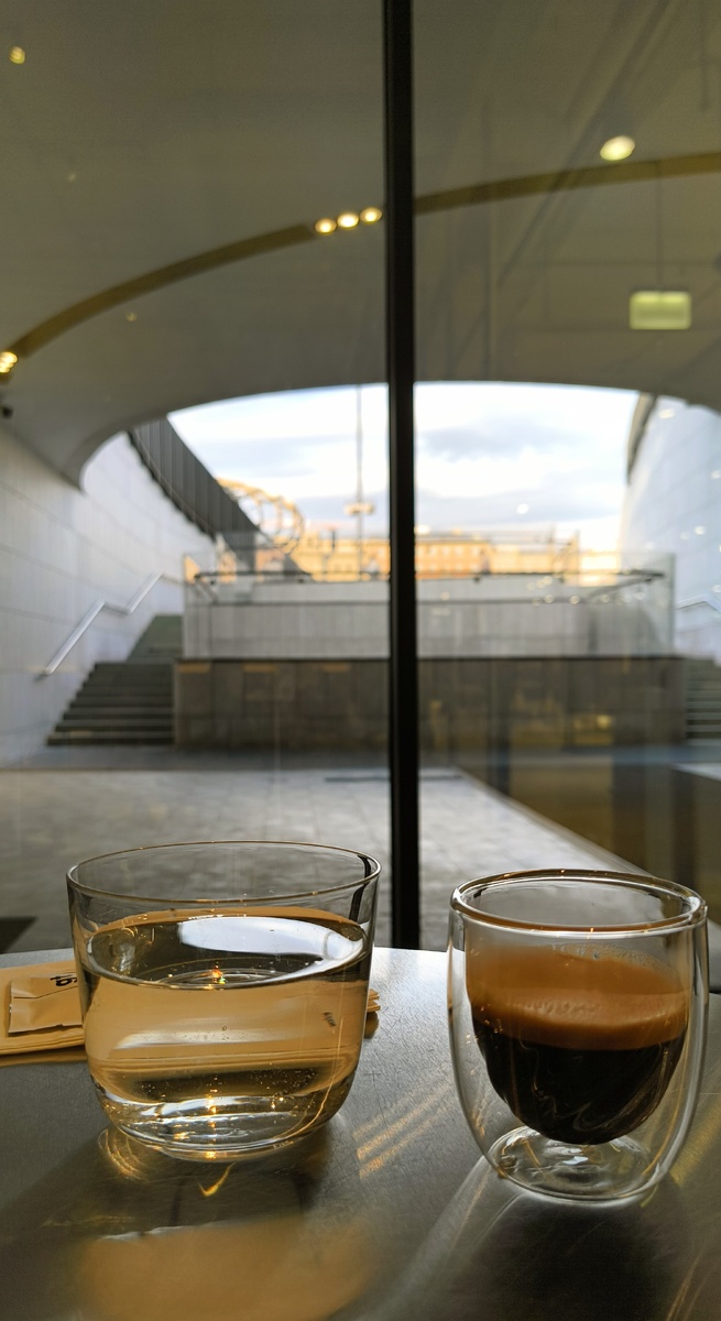 Случайная, но приятная находка — кафе в мужском отделе магазина LIME. Здесь очень мало посетителей, приветливый персонал, приятный и современный интерьер. Как и само кафе, вид из окна брутальный — на лестницу и виден огромный кусок неба, это красиво. Кафе идеально чистое. Стальные столы, хорошие деревянные стулья и диваны из материала под бетон с подушками. Сидеть удобно и садиться можно везде — отличное решение. Кофе эспрессо подают со стаканом воды в приятной прозрачной посуде. Вкус яркий, ягодный, очень плотный, освежающий, немного горький. Вердикт: кофе хороший и очень бодрящий.