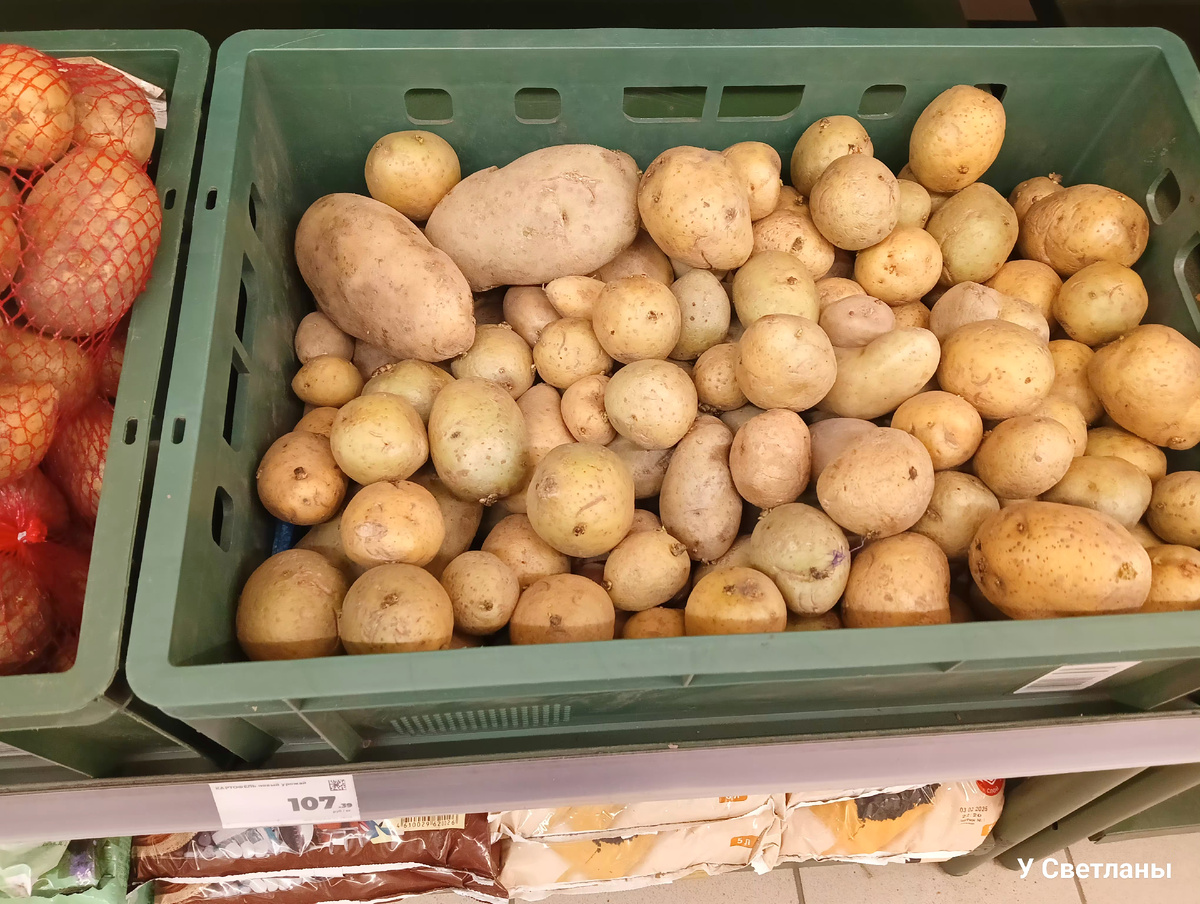 Придя в Магнит, я офонарела от цен на картошку. Цены от ста рублей и выше. Например эта - 107р/кг. Да, чистенькая, гладенькая и верю, что разваристая, но извините меня, дорого.