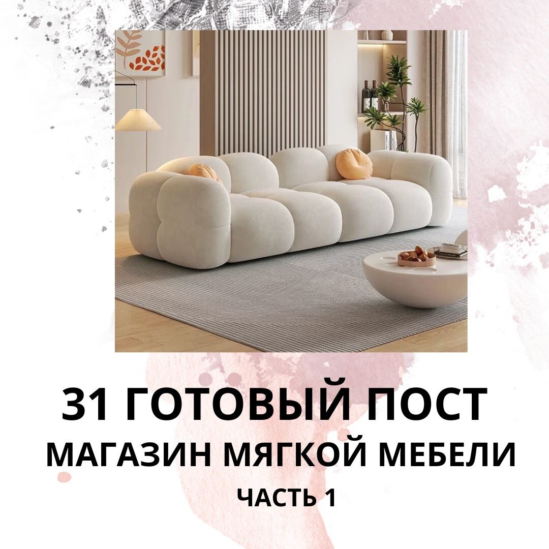 Купить посты можете на ВБ: Темы постов: 1.Как выбрать диван для гостиной? Несколько простых советов 2.Уютные моменты: как диван может изменить атмосферу вашего дома? 3.Мебель на заказ: почему это выгодно и удобно? 4.Как выбрать диван для небольшой квартиры? Рекомендации 5.Почему стоит выбирать диван с механизмом трансформации? 6.Советы по уходу за мягкой мебелью, чтобы она служила долго 7.Как выбрать диван для семьи с детьми? 8.Модульные диваны: универсальное решение для разных стилей 9.Как выбрать диван для отдыха и сна: особенности моделей 10.5 ошибок при выборе дивана, которых стоит избегать 11.Как создать уютную атмосферу в доме с помощью мягкой мебели? 12.Выбор дивана для загородного дома или дачи 13.Почему диван — это не просто мебель, а центр вашего уюта? 14.Ткани для обивки: как выбрать между кожей и тканью? 15.Как выбрать диван для вашего офиса или рабочего пространства? 16.Мебель для маленькой спальни: как выбрать идеальный диван? 17.Как правильно ухаживать за кожаной мебелью