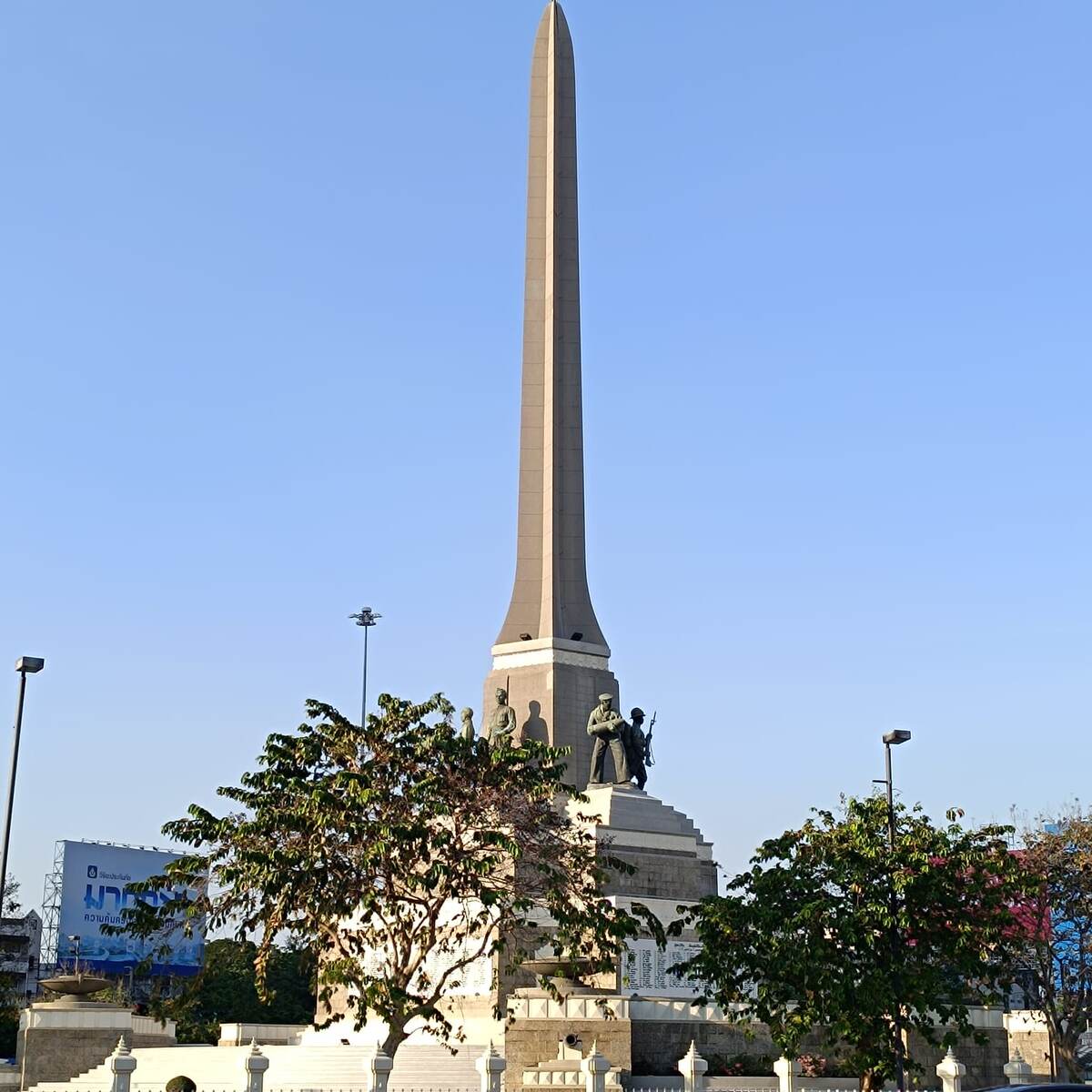 Бангкок встретил нас платным проездом и пробками. Пробки были такие, что висели дорожные знаки, запрещающие менять полосу движения. Никаких выделенных полос для машин скорой помощи и такси, все толкались в одной очереди. В центре Бангкока, проездом из окна трансфера увидели правительственное здание с охраной, рядом с ним - Монумент Победы, все это выглядело очень серьёзно: