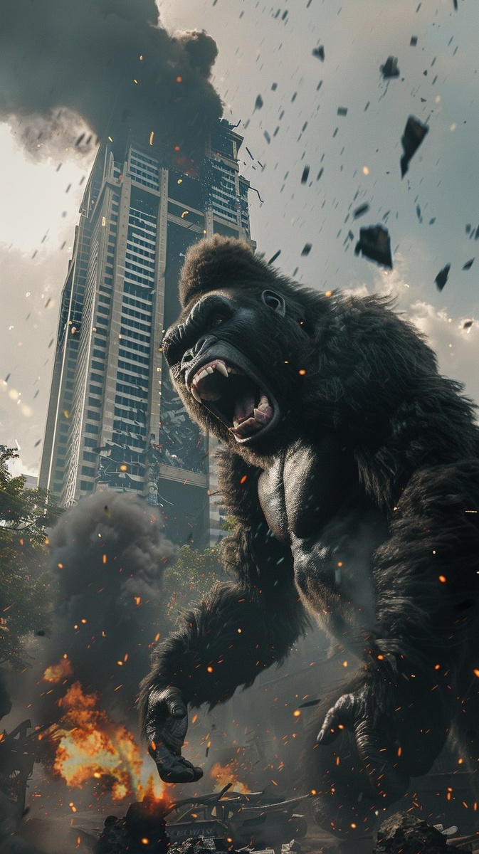 Создано на основе запроса: a giant angry gorilla rampaging through Jakarta monas, skyscrapers collapsing, people screaming, cinematic chaos