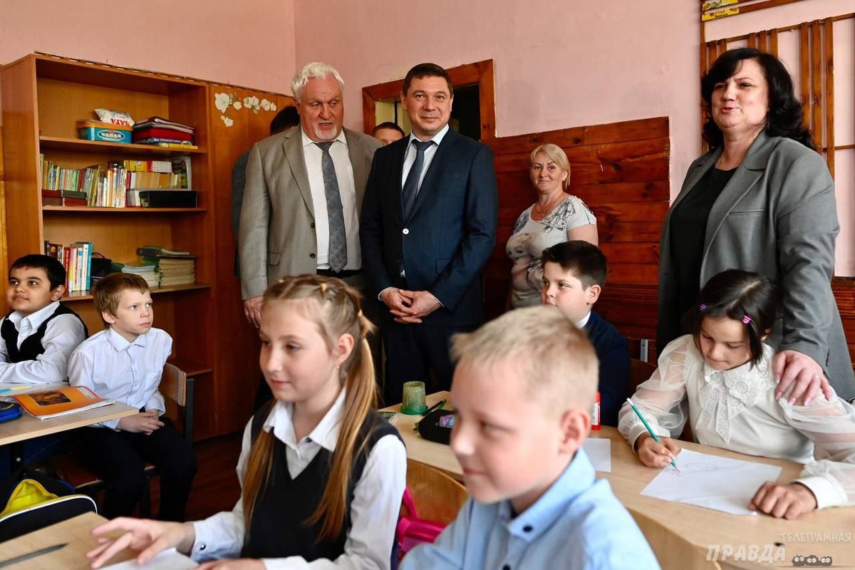 В Первомайском округе сначала заехал в школу и детский сад в селе Хоботово, как и обещал жителям в январе на личном приёме.
