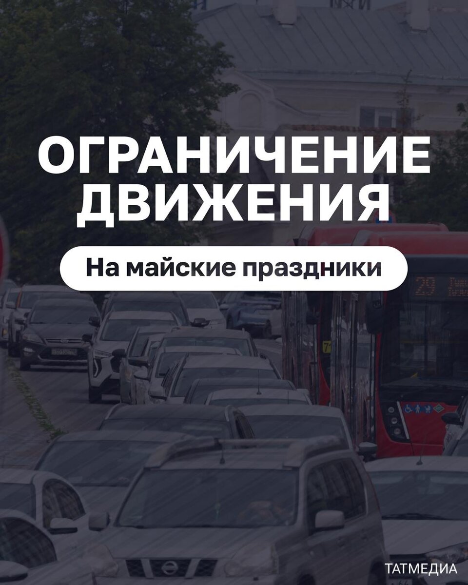 В ответ на пост ⚜️🚗 В Казани уточнили планы по ограничению движения в мае На время майских праздников в городе при необходимости будут перекрыты некоторые дороги. Перечислили адреса в карточках. @tatmediaofficial