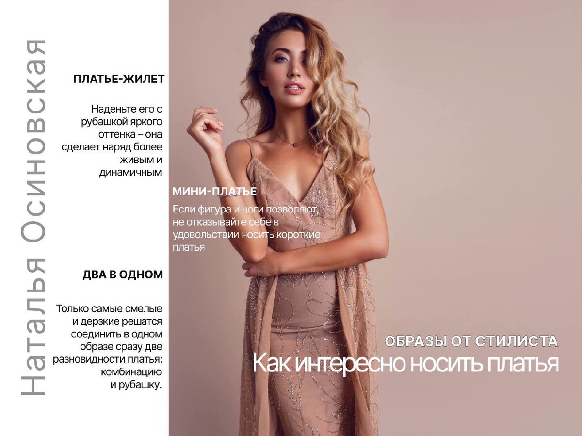 Как интересно носить платья: образы от стилиста Платье – самый женственный предмет гардероба. И самодостаточный: надела его, дополнила аксессуарами – и вперёд! Но с платьями можно составлять и более сложные комплекты.