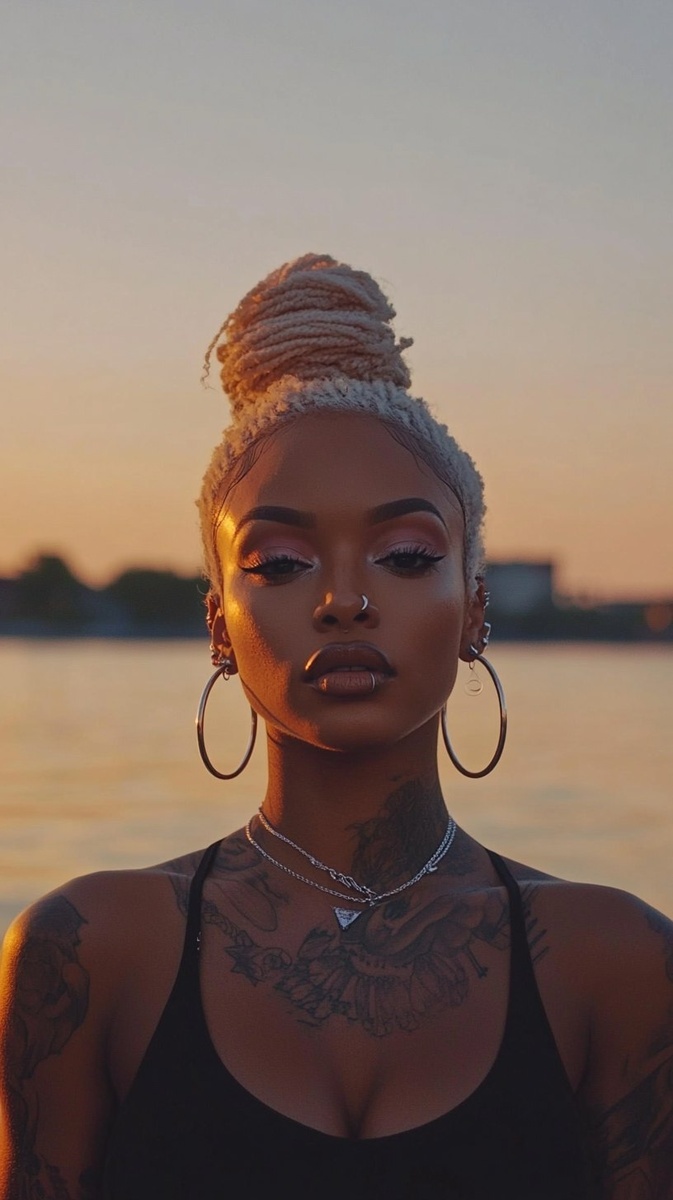Создано на основе запроса: Screenshot of an old, low-quality video post from TikTok, showing the full body and face of an African American woman with blonde hair, wearing makeup and large hoop earrings, standing in front of water at sunset. She has piercings on her lips, neck, and ears, as well as tattoos. She is dressed for summer in a black tank top. The scene was shot with a Canon EOS camera with an EF-S lens, 85mm f/2.4G, using Kodak Gold ISO 300 film stock. --- Автоперевод: Скриншот старого, низкокачественного видео пост от Tiktok, показывающий полное тело и лицо афроамериканской женщины со светлыми волосами, носить макияж и большие серьги-обручи, стоящие перед водой на закате. Отлично выглядит? 🤔 https://dzen.ru/id/65c0c65c86e4f837c27b24d7 #ИИ #AI #нейросеть #midjourney #art