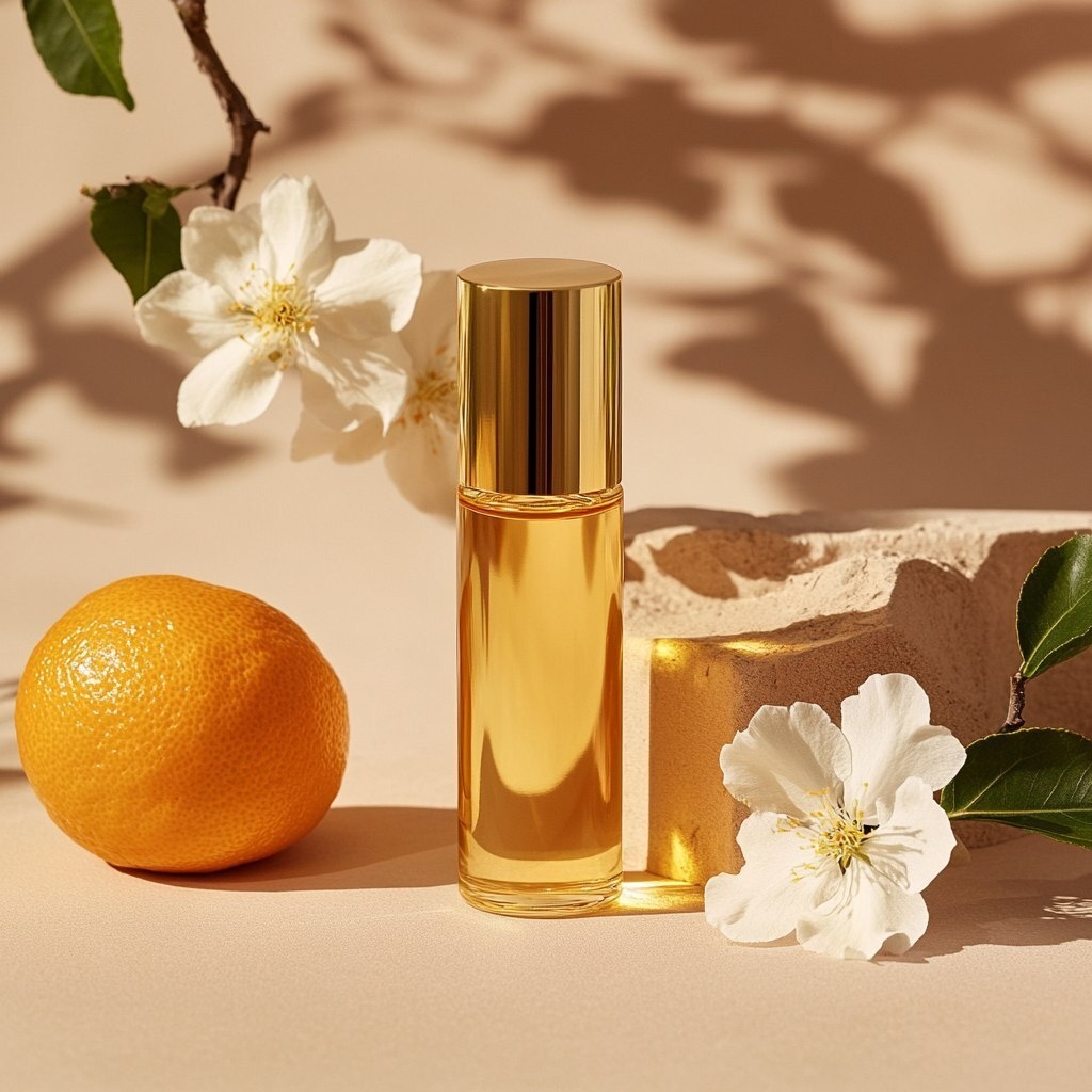 Создано на основе запроса: Product photography of an amber glass roller bottle with a gold lid, filled only with yellow oil perfume liquid. jasmine flowers around the bottle. there is a mandarin and sandalwood. All set against a beige background in a minimalistic style with warm tones. Image taken in the desert. Minimalist style with neutral tones, soft lighting, and high resolution. High-resolution image shot with a Canon EOS R5 --- Автоперевод: Фотография продукта из янтарной стеклянной бутылки с золотой крышкой, заполненной только желтой масляной парфюмерной жидкостью. Как тебе эта генерация? 🤔 https://dzen.ru/id/65c0c65c86e4f837c27b24d7 #ИИ #AI #нейросеть #midjourney #art