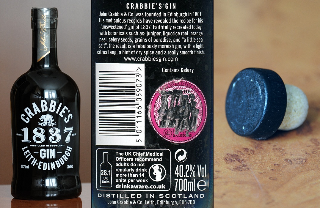 бы, (всяческими Шотландиями и Ирландиями) репутацией. Но, нет, оказывается, джин из Ливерпуля вполне себе дистиллирован в Эдинбурге, что собственно следует из его названия. Неисповедимы пути твои, островной госпади… John Crabbie & Co Crabbie`s 1837 Leith Edinburgh Gin. Приземистая, "портовая" (в смысле – «портвейная») бутылка чёрного цвета с основными надписями белым шрифтом разного кегля. Приобретение мотивировано информацией продавщицы о прекращении поставок в РФ от этого производителя. Из необычного – умилительные 40,2% алкоголя (поди, найди эти 0,2% в органолептике продукта или утренней головной боли), и