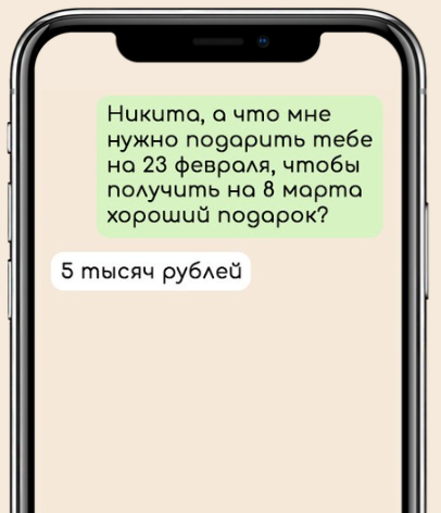 Казалось бы, всё просто: на 23 февраля — носки и пену для бритья, на 8 марта — цветы и конфеты. Но только в теории. А вот на практике начинаются целые торги, обсуждения, намёки, обиды и... конечно же, смешные переписки, в которых парень и девушка пытаются решить самую главную задачу этого времени года — не остаться без подарка и при этом не потратить ползарплаты.