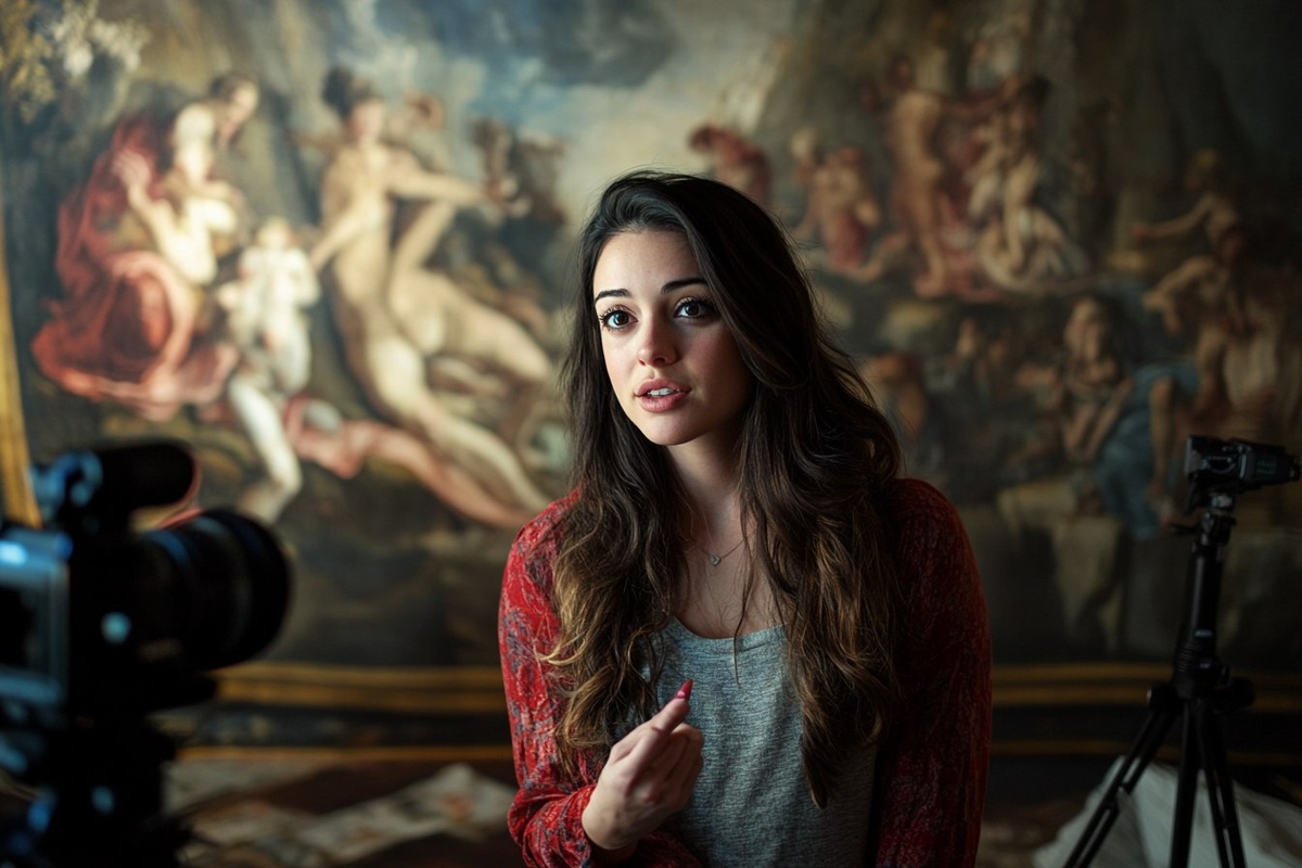 Создано на основе запроса: photo realistic, medium wide shot, pretty woman giving interview to camera, background is baroque painting of bodies