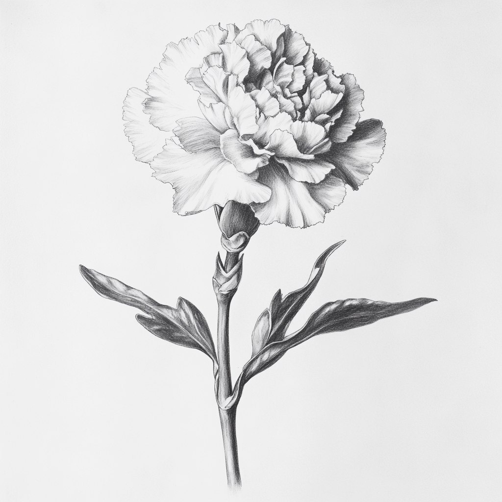 Создано на основе запроса: pencil drawing, carnation flower with stem and leaves