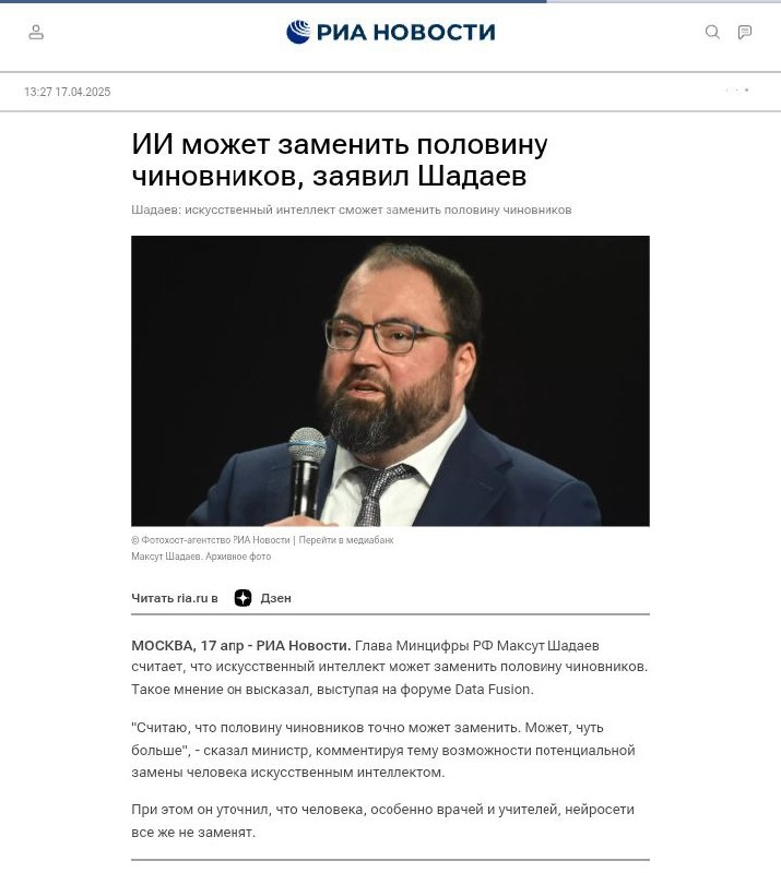 ВРАЧЕЙ И УЧИТЕЛЕЙ НЕЙРОСЕТИ НЕ ЗАМЕНЯТ ----------- Глава Минцифры РФ Максут Шадаев считает, что искусственный интеллект может заменить половину чиновников. Такое мнение он высказал, выступая на форуме Data Fusion. "Считаю, что половину чиновников точно может заменить. Может, чуть больше", - сказал министр, комментируя тему возможности потенциальной замены человека искусственным интеллектом. При этом он уточнил, что человека, особенно врачей и учителей, нейросети все же не заменят. ©: РИА Новости https://ria.ru/20250417/intellekt-2011797258.html