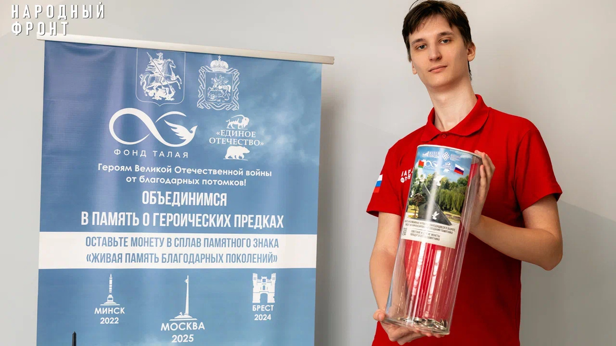 Общественное движение «Народный фронт» активно поддержало инициативу по сбору монет и гильз, предложенную белорусским благотворительным фондом имени Алексея Талая. Эта акция направлена на создание мемориала «Живая память благодарных поколений», который будет установлен в честь 80-летия Великой Победы. В региональных отделениях «Народного фронта» были установлены специальные контейнеры для сбора монет и гильз. Эти материалы станут частью памятника, который планируется установить на Поклонной горе. Идея создания памятника с использованием советских монет принадлежит паралимпийцу и общественному деятелю Алексею Талаю. Этот мемориал станет третьим в рамках проекта «Живая память благодарных поколений». Первые два уже установлены в значимых местах союзного пространства — в городе-герое Минске и Брестской крепости-герое. Президент России Владимир Путин и президент Беларуси Александр Лукашенко лично приняли участие в сборе монет для памятника. От имени Владимира Путина советские монеты фонду п