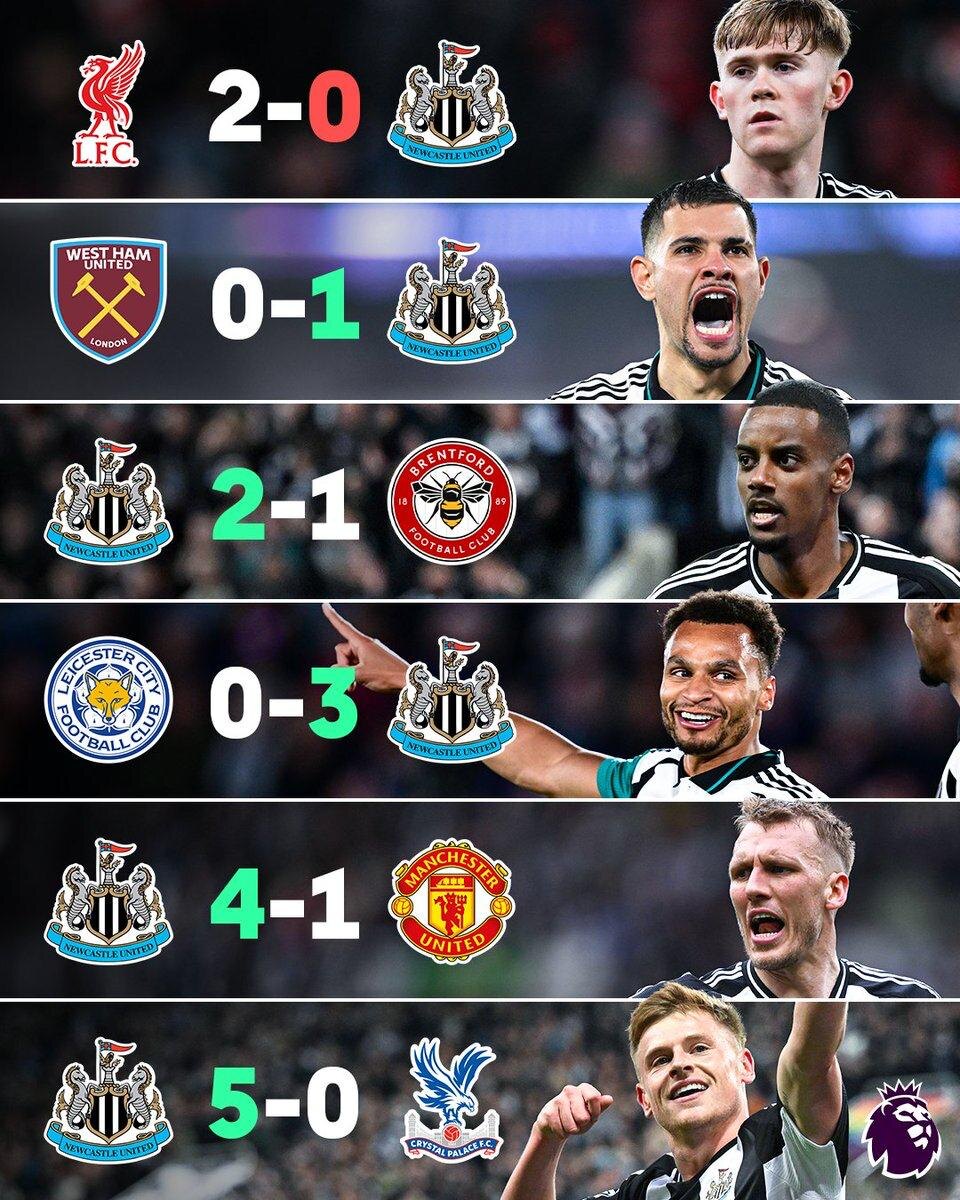 0, 1, 2, 3, 4, 5! "Ньюкасл" одержал пять побед кряду в Премьер-Лиге, причем каждый раз "сороки" забивали на один гол больше, чем в предыдущем матче. На очереди "Астон Вилла" 😲