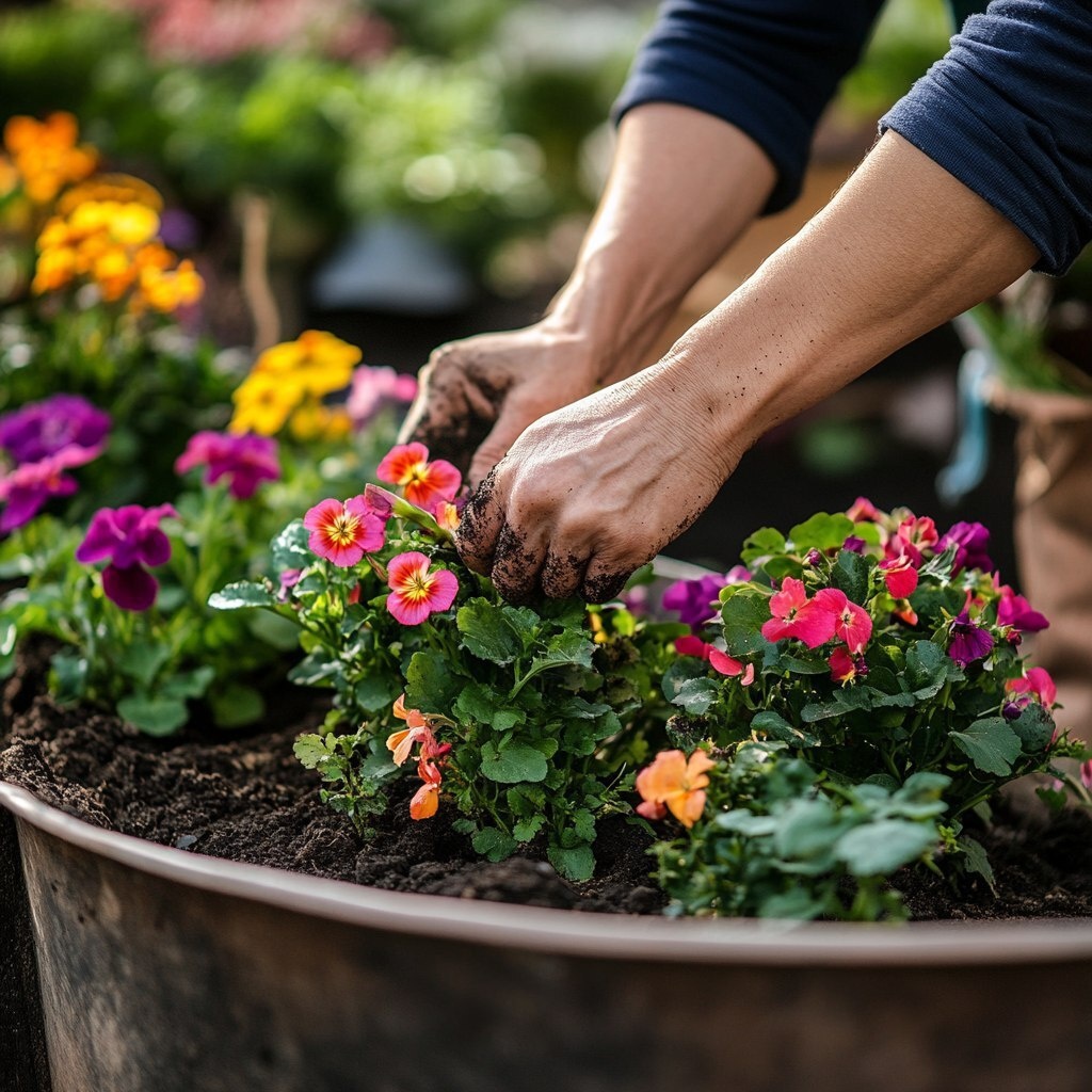 Создано на основе запроса: hands planting flowers in a large container, photo
