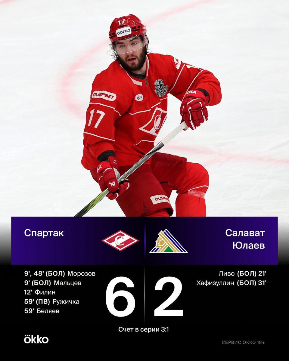 «Спартак» громит «Салават» в Москве 👏 Главный герой серии Адам Ружичка в огне – на счету словака гол и ассистентский дубль. Теперь «Спартак» ведёт 3:1 в серии. Помог новый рекорд посещаемости на «Мегаспорте» 😉