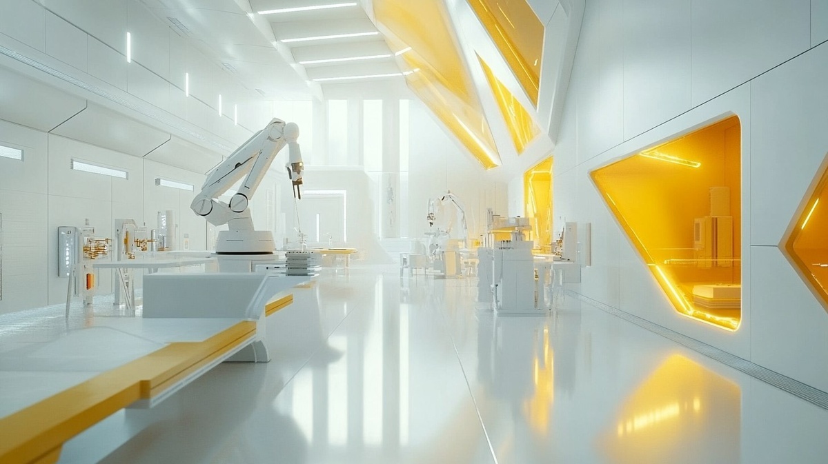 Создано на основе запроса: a brightly lit futuristic robotics lab of a mad scientist, the architecture is geometric and white, the room brightly lit, with areas of leaking yellow light