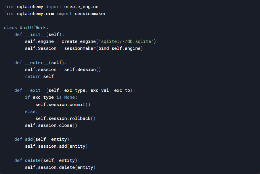 Паттерн Unit of Work (UoW) — это подход к организации бизнес-транзакций, при котором все изменения данных (добавление, обновление, удаление) отслеживаются и фиксируются в базе данных атомарно. Он особенно полезен в приложениях, где несколько операций с данными должны выполняться как единое целое: либо все успешно завершаются, либо ни одна не применяется. В Python этот паттерн часто используется вместе с ORM (например, SQLAlchemy) или реализуется вручную для гибкого контроля над транзакциями. 1. Атомарность: Гарантирует, что группа операций будет выполнена полностью или отменена. 2. Оптимизация производительности: Батчинг запросов к БД (например, один COMMIT вместо множества мелких). 3. Упрощение кода: Отслеживание изменений и управление транзакциями выносится в отдельный слой. 4. Согласованность данных: Избегает частичных обновлений, которые могут нарушить целостность. 1. Отслеживание изменений: UoW запоминает все новые, изменённые и удаляемые объекты. 2. Фиксация или откат: При вызове